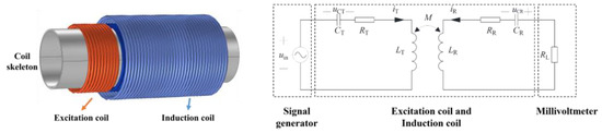 A magnetic resonance sensor [28] was used to monitor the working stress of the rebar. The sensor’s two coils are the excitation and induction coils. The coil is wound on the PVC skeleton, as shown in Figure 1. The equivalent circuit diagram [28] of the magnetic resonance sensor is shown in Figure 1. LT and LR are the inductance of the excitation coil and induction coil, respectively. CT and CR are the excitation and induction coil’s compensation capacitors, respectively. uCT and uCR are the voltage of the compensation capacitor of the excitation coil and the induction coil. RT and RR are the internal resistance of the excitation coil and the induction coil, respectively. The voltage source is AC power, and the input voltage is uin. The millivoltmeter is regarded as a load connected in series with an induction coil, and its equivalent resistance is RL.