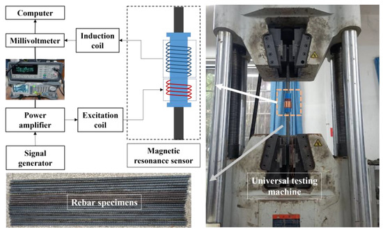 A rebar working stress monitoring system was built to carry out the experiment, as shown in Figure 2. The experiment system comprised a universal testing machine, magnetic resonance sensor, signal generator, power amplifier, millivoltmeter, and computer. The maximum tensioning load of the universal testing machine is 100 tons. The universal testing machine was used to tension the rebar to different stress levels. In this experiment, a magnetic resonance sensor was used for working stress monitoring. The signal type for data analysis was induced voltage. The induced voltage peak-to-peak value was chosen as the electrical characteristic value characterizing the variation of the magnetic properties of the rebar with stress. The signal generator was connected to the excitation coil. The millivoltmeter was considered as a resistor connected to the induction coil. The signal generator generated an alternating excitation signal as a sine wave. The power amplifier was used to amplify the excitation signal power. The effective value of the induced voltage was measured by the millivoltmeter during the experiment. The value was transmitted and saved in the computer for further processing.