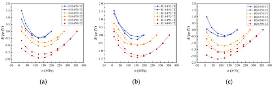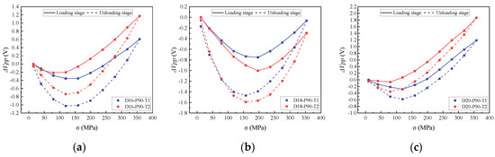 The corresponding ΔVpp-Tp curves were similar for each specimen. Therefore, the design stress range of 90% yield strength in each group of specimens was selected for further analysis. As shown in Figure 4, the relationship of the ΔVpp-σ was similar for the same stressing process for different rebars. During the loading stage, the ΔVpp decreased and then increased with the increase of working stress. During the unloading stage, the ΔVpp decreased and then increased with the decrease of working stress. The corresponding ΔVpp-σ curves in the loading and unloading stages were different. The same stress level in loading and unloading corresponded to two different ΔVpp. This was due to the hysteresis of the rebar as a ferromagnetic material after loading and unloading [40].