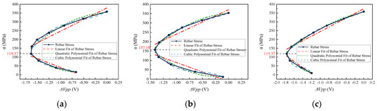 The whole unloading stage bounded by the turning point can be divided into two sections: the high stress section and low stress section. Since the importance of the two sections was the same, it was necessary to evaluate the fit effect as a whole. The Taylor expansion of Equation (13) was carried out, the higher order term after the third order was ignored, and Equation (14) was obtained. The first, second, and third orders of the corresponding relationship between the ΔVpp and rebar working stress were discussed separately, as shown in Equation (15). The turning points of the corresponding curves of each specimen in Figure 6 were 119.37 MPa, 157.19 MPa, and 119.37 MPa, respectively. Taking the turning point as the dividing line, the three specimens were fitted to obtain the corresponding linear, quadratic, and cubic fit curves. Therefore, the goodness of fit (R2) was used to evaluate the fit effect. The R2 of each specimen was calculated based on two segmented data.