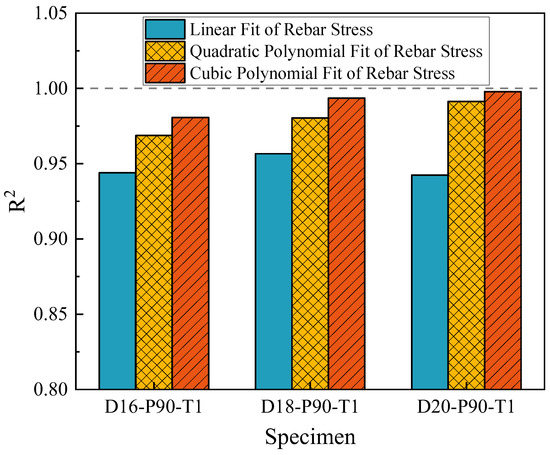 As shown in Figure 8, the R2 of D18-P50-T2 was at least 0.96928. The R2 of each specimen was more significant than 0.96, indicating a high degree of compliance with the cubic polynomial fit of the line between σ-ΔVpp. Therefore, the working stress of the rebar could be determined from the σ-ΔVpp curve.