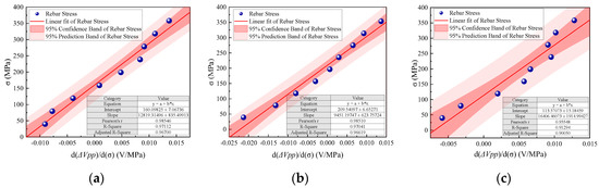 The overall linear fitting of the relationship between working stress and dΔVpp of three diameter rebars: (a) D16-P90-T2; (b) D18-P90-T2; (c) D20-P90-T2.