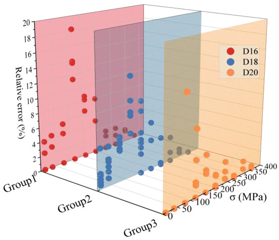 For Method 1, the curve fit degree was good; all groups’ R2 were greater than 0.96. This showed that working stress had an excellent functioning relationship with the ΔVpp. The fit relationship was generalized to Equation (16). The measured ΔVpp was substituted into the fit equation. The results were compared with the actual measured working stress. The relative error values of each specimen were calculated as shown in Figure 12.