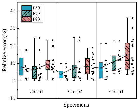 From the error analysis of the fitted and measured values under the unloading stage, it was found that the relative error values did not exceed 20% under any working conditions. The relative error values were concentrated below 10% in the high stress section. The measured ΔVpp was substituted into the corresponding fit equation under different working conditions. The percentage of relative error at the turning point of D20-P90-T1 was the highest, 18.21%, and the maximum relative error between the fitted and measured value was 21.73 MPa. The high relative errors were concentrated near the turning point. Therefore, increasing the measurement points near the measured turning points during the calibration in the laboratory could significantly reduce the relative error. The relative error values of all specimens were normalized, and the average relative error values with robustness were used for comparative analysis. The maximum average relative error values for Group 1, Group 2, and Group 3 at different stress levels were 3.68%, 4.16%, and 2.79%, respectively. The average relative error values for all specimens were less than 5%, close to the results of the REME method for testing strand stresses [28].
