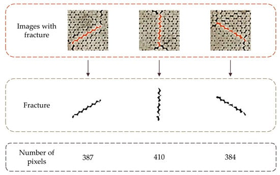 - The fractures had different lengths. Therefore, when counting the number of fractures, it was necessary to integrate the fractures. This study took a typical fracture as a standard fracture, counted the number of pixels of the standard fracture, and then calculated the number of fractures;