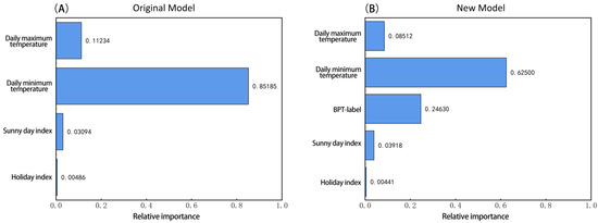 - Among the input variables of the daily energy consumption prediction model, the dominant variable is the daily minimum temperature, which is much more important than the daily maximum temperature. The balance point temperature label is crucial in the prediction model and accounts for 25% of the importance.