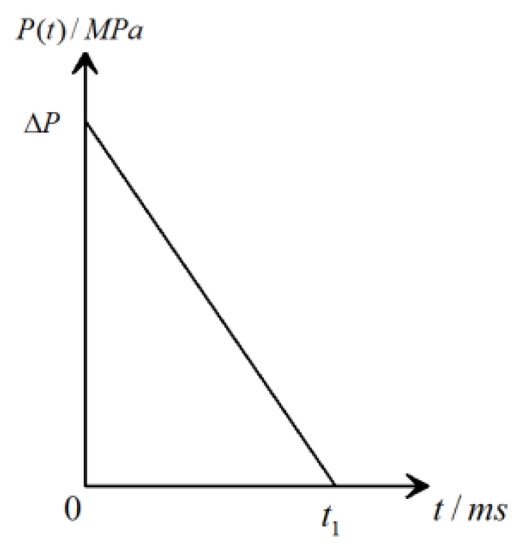 in Figure 4 is the peak overpressure of the blast load (MPa). Six calculating conditions with values of 7 MPa, 10 MPa, 11 MPa, 12 MPa, 13 MPa, and 14 MPa are selected, respectively. is uniformly taken as 100 ms. The load shown in Figure 4 is applied normally to the blast surface of the protective door and the door frame wall.