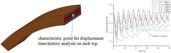 Figure 5 shows that at the top of the protective door arch, when is 7 MPa, the displacement time-history curve oscillates regularly about the zero scale, which shows the elastic dynamic response of the protective door. When is 10 MPa–12 MPa, the displacement time-history curve of the top of the arch is generally below the zero scale. After reaching the peak of negative displacement, it still presents regular damped vibration, which indicates the stable elastic-plastic vibration of the protective door. When reaches 13 MPa, there is a sudden change in the displacement time-history curve of the arch top, and there will no longer be stable vibration after reaching the peak of negative displacement. This indicates imminent plastic instability. Figure 6 shows that the displacement time-history change law on the 1/4 arch span is similar to that of the arch top, and there is a sudden change in the shape of the displacement time-history curve when reaches 13 MPa. This phenomenon coincides with the results observed by Budiansky and Roth in their study of the dynamic stability of spherical shells. They observed that, for a certain load level, when a small increment of the load causes a large change in the displacement response of the structure, the structure undergoes dynamic buckling, i.e., instability at the extreme point, and the corresponding load is referred to as the dynamic damage critical load [22]. This problem is also associated with a sudden change in the shape of the displacement time-history curve at the characteristic point when is between 12 MPa and 13 MPa. Then, the corresponding to the instant of sudden change can be considered as the ultimate load that the protective door can withstand.