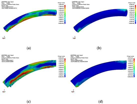 The loading time of the two figures above is uniformly taken as the end of the simulation, i.e., 100 ms. Under the blast load of = 10 MPa, the inner concrete basically does not appear to be damaged. The confined concrete is dislodged on the tensile side, and the steel tube, surface panel, and separators enter the plastic state at the top and the foot of the arch in a part of the section. When = 12 MPa, the inner concrete and confined concrete at the foot of the arch are fractured, and the steel tube, surface panel, and separators show concentrated plastic strain distributions at the foot of the arch, indicating the trend of the plastic state of the entire section. Under the two different blast loads, the damage mode of the protective door is changed. When = 10 MPa, the protective door is damaged to some extent at the top and foot of the arch, but the damage limit is not yet reached. When = 12 MPa, the protective door suffers serious damage, mainly in the arch foot, which is close to the damage limit.