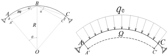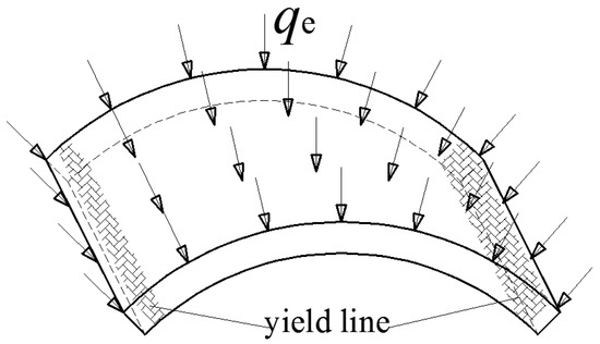 According to the analysis results presented in Section 3.2, under large blast loads (11 MPa), the regions of plastic damage are mainly located at the foot of the arch. In practical engineering design, it is necessary to consider the situation where the door is subjected to large blast loads, making the arch foot the most susceptible to damage, and the damage limit of the arch determines the load-bearing capacity of the door. According to the yield line theory [23], the plastic hinge formed at the foot of the arch when subjected to a radial blast load uniformly distributed on the outer surface is, by definition, the yield line. The protective door slides and collapses along the yield line and eventually becomes a geometrically unstable system. The diagram of the yield line is as follows: