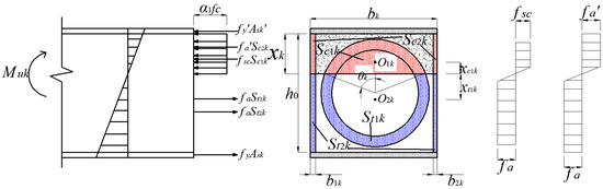In Equation (11), ; is the concrete-filled steel tube confinement factor, and ; is the steel tube cross-sectional area in the concrete-filled steel tube; is the concrete cross-sectional area in the concrete-filled steel tube; , are the area of the concrete-filled steel tube in the compression zone and tension zone of the kth calculated section.