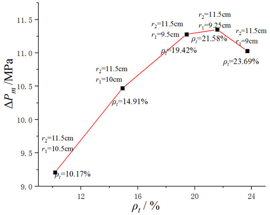 At = 19.42%, the corresponding relationship between different section occupancies of the concrete-filled steel tube and the blast resistance of the protective door is shown in Figure 13. At = 61.14%, the corresponding relationship between the different section occupancies of the steel tube and the blast resistance of the protective door is shown in Figure 14.