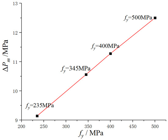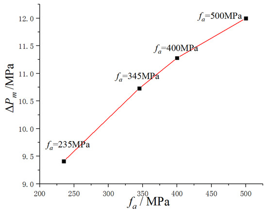 The relationship between the strength of the steel tube and the load-bearing capacity of the protective door is shown in Figure 15, and the relationship between the strength of the concrete inside the steel tube and the load-bearing capacity of the protective door is shown in Figure 16.