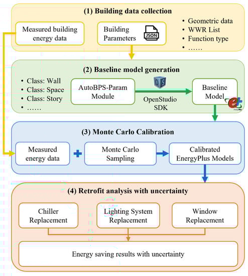 A shopping mall building in Changsha, China, was selected for the case study, where the monthly electricity and natural gas usage data and the detailed layout of each floor were available. Figure 1 shows the overall workflow of this study. First, the basic building information was collected via on-site visits, and the monthly energy consumption data were downloaded from the building management system. Then, a baseline model is generated using the AutoBPS-param based on limited building information. AutoBPS-Param is developed to automatically generate an EnergyPlus model based on basic information, including building type, year built, climate zone, number of stories above and below ground, floor-to-floor height, window-to-wall ratio (WWR) in each direction, width, height, and so on. Users can customize the building geometry while the building systems (envelope, internal zones, heating, ventilation, and air conditioning system) are assigned based on the building type, year built, and climate zone to meet the local and national standards. Moreover, a calibration method based on Monte Carlo sampling was conducted to calibrate the baseline model using measured monthly electricity and natural gas usage data, which can generate multiple calibrated EnergyPlus models. At last, those calibrated EnergyPlus models are used to perform retrofit analysis with uncertainty.