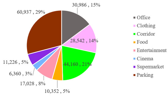 Changsha is located in hot summer and cold winter regions with high humidity throughout the year. The floor-to-floor height of the shopping mall is 4.7 m. The building has windows on the first floors with windows to wall ratio (WWR) of 0.35 on the east, 0.56 on the south, 0.35 on the west, and 0.3 on the north. The building area is 209,591 square meters. Figure 2 shows the floor plans of the building. Through on-site visits and the Baidu map (a web map that is widely used in China), the building is divided into eight functional types for the interior spaces, including parking, food, office, cinema, corridor, clothing, supermarket, and entertainment. The area of each function type is shown in Figure 3.