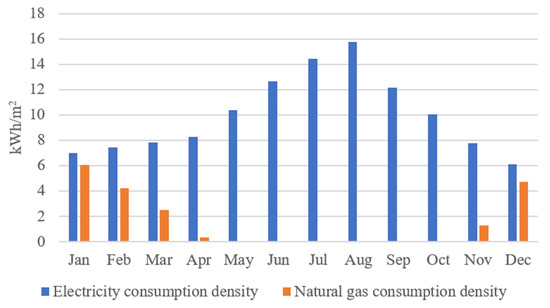 Figure 4 shows the monthly energy usage intensity of electricity and natural gas. The measured annual electricity consumption of the shopping mall is 25.2 GWh, with an electricity consumption intensity of 119.8 kWh/m2. The annual natural gas consumption of shopping malls is 14.4 × 103 GJ, and natural gas usage intensity is 68.6 MJ/m2 (19.1 kWh/m2). The electricity consumption intensity of shopping malls shows a parabolic distribution month by month, with the highest electricity consumption density in summer, reaching a peak of 3.0 GWh (15.8 kWh/m2) in July, and the lowest electricity consumption in December, reaching 1.6 GWh (6.1 kWh/m2). The usage of natural gas is opposite to electricity consumption, with the highest usage in winter and spring, reaching a peak of 1.27 GWh (6.0 kWh/m2) in January. Natural gas is not used in summer and autumn.