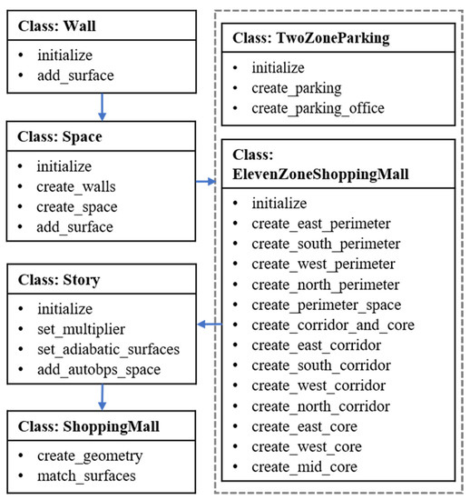 Figure 5 shows the AutoBPS-Param structure for the shopping mall. It relied on OpenStudio Software Development Kit (SDK) and defined some Ruby classes. Some methods were defined under each class. The Wall class was used to create a wall and add windows to the given space. Then, the Space class utilized the Wall class to create a space based on a polygon. The TwoZoneParking class was used to create the underground floor with two thermal zones for the shopping mall. The ElevenZoneShoppingMall class was used to create the standard floor above ground with eleven thermal zones. In addition, the Story class was utilized to set boundary conditions. At last, the ShoppingMall class was applied to create the geometric model by calling other classes.