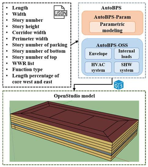 Figure 6 shows the workflow of baseline model generation. To simplify the model, the shape is rectangular with perimeter, corridor, and core areas. Some required geometric parameters are input in JavaScript Object Notation (JSON) format, including length, width, the number of floors, floor height, corridor width, perimeter width, story number of parking/bottom/top, WWR list, space type, length percentage of the west and east core. When the JSON file is ready, the AutoBPS-Param module automatically generates the geometric model. Some non-geometric parameters, such as envelope, internal loads, HVAC system, and service hot water (SHW) system, are assigned to the building through the AutoBPS-OSS module. AutoBPS-OSS is a Ruby-based library based on OpenStudio-Standards (OSS). OSS is developed by the National Renewable Energy Laboratory (NREL) to create American prototype-building models. The Chinese building standards are added to set up the Chinese prototype database. Then, the OpenStudio model is output by two modules.
