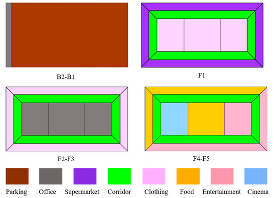 The detailed layout of the shopping mall prototype model is shown in Figure 7. The length and width of the building were 238 m and 126 m. The width of the perimeter and corridor were 15 m and 16 m. There were two parking stories below ground. The spaces in the inner ring were set as the corridor. Other spaces were set up as offices, clothing, food, entertainment, cinemas, and supermarkets while ensuring the basic consistency of floor area as the actual floor area. The second and third floors had the same layout, as did the fourth and fifth floors.