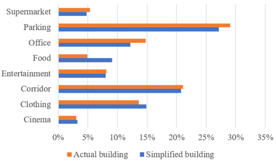 To ensure that the simplified model was consistent with the actual model, the total area of the building and the percentage of the area of each space were compared separately. The actual area of the mall is 209,591 m2, and the area of the simplified model is 209,916 m2, with a relative error of 0.15%. Figure 8 shows the area ratio of each functional zone before and after simplification. It can be seen that the area share of the actual building and the simplified model were consistent. The relative error was between −0.13% and 4.13%. This also indicated that the simplified model kept the geometric information of the actual building well and had strong reliability.