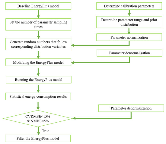 The implementation of the Monte Carlo sampling calibration method is shown in Figure 9. Firstly, based on the established reference model, the parameters that need to be calibrated are determined, and the range and prior distribution of the parameters are established. Next, the number of models to be sampled needs to be set, and the parameters need to be normalized and processed to generate random numbers corresponding to the sampling number. The inverse normalization of the random number is used to modify the actual parameters of the model. The modified EnergyPlus model is run, and the energy consumption results of all sampled models are collected and compared with the measured energy consumption data. Models that meet the calibration criteria based on the normalized mean bias error (NMBE) not exceeding 5% and coefficient of variation of the root mean square error (CVRMSE) not exceeding 15% are selected as the calibrated models. The calibrated models are then used to predict the energy consumption of the building.