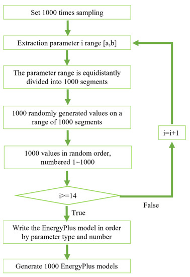 Monte Carlo methods use parameter-based probability distributions for random sampling. A Monte Carlo sampling method based on the Latin hypercube (LHS) can be used to reduce the number of samples while maintaining sampling quality. The LHS samples the sample space by strata, requiring forced sampling from each stratum, thus ensuring full coverage of all samples. To ensure that the values of each parameter are randomly combined, the sample size should be large enough. In this study, a sample size of 1000 is taken. The sampling first divides the range of each parameter into 1000 parts and then randomly selects sample points from each part for random combinations between each parameter while ensuring that the data in each layer can be taken. The specific sampling flow chart is shown in Figure 10.