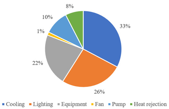 After model calibration, the calibrated energy models can be used for retrofit analysis to evaluate energy saving potential of ECMs. When performing energy efficiency improvement of buildings, it is necessary to analyze the energy consumption of the building. For the convenience of research, the baseline energy model was selected as the research object to analyze its energy consumption situation. The simulated electricity consumption result of the baseline energy model is shown in Figure 11. The two highest percentages of energy consumption are cooling energy consumption for chillers (33%) and lighting energy consumption (26%).