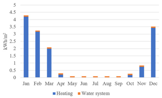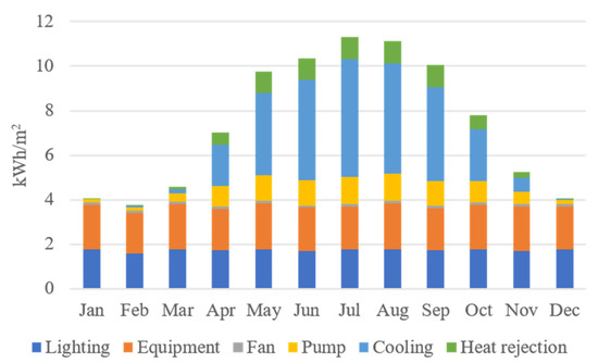 Figure 12 shows the simulated monthly electricity energy use intensity (EUI) by end-use. The annual electricity consumption of the shopping mall is 18.9 GWh, with an EUI of 89.9 kWh/m2. The electricity EUIs of end-users are 20.78 kWh/m2 for lighting, 23.58 kWh/m2 for plug loads, 27.7 kWh/m2 for chillers, 10.4 kWh/m2 for fans and pumps, and 6.6 kWh/m2 for cooling towers. The monthly natural gas EUI of the shopping mall is shown in Figure 13. The annual gas consumption of the shopping mall is 11.3 × 103 GJ, which is 15.04 kWh/m2. Natural gas is used for space heating in winter and domestic hot water supply in winter. Among them, winter space heating accounts for 92% of natural gas consumption.