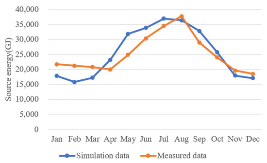After establishing the baseline model, the model’s energy consumption was compared with the measured energy consumption to ensure that the model matched the actual situation. The errors between measured and simulated monthly energy consumption were calculated using source energy as the standard for total building energy consumption. After calculation, the NMBE and CVRMSE of the baseline energy model are 25.1% and 25.7%, both of which do not meet the requirements. The lighting power density, plug load power density, chiller COP value, fan efficiency, and pump efficiency are manually calibrated. Figure 14 shows the source energy consumption of the simulated results of the manually calibrated model and the measured data. The NMBE and CVRMSE are 1.54% and 14.7% for the manually calibrated model.