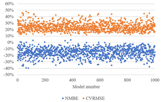 After obtaining 1000 uniformly distributed samples, there will be a certain error between the simulation results and the actual results. Referring to the standard ASHRAE 14 in the United States, the monthly NMBE should not exceed 5%, and the CVRMSE should not exceed 15%.