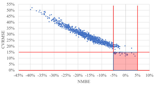 Models that meet the accuracy requirements are selected based on the criteria of NMBE not exceeding 5% and CVRMSE not exceeding 15%. The selection results are shown in Figure 16. The horizontal axis shows the NMBE value, and the vertical axis shows the CVRMSE value. A red region is established with a target of CVRMSE <15% and −5% < NMBE < 5%. A total of 29 models fall within the red region. The CVRMSE values of the 29 models range from 10% to 15%.