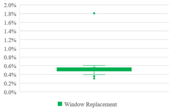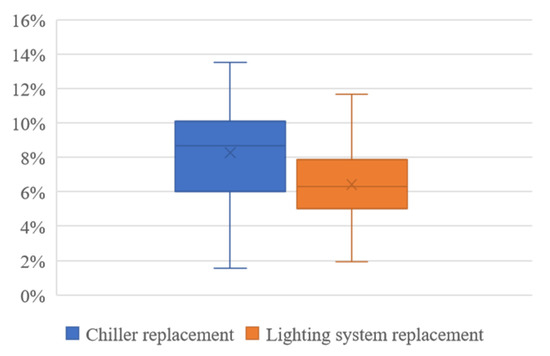 After the model calibration, 29 calibrated EnergyPlus models were obtained. Three ECMs are evaluated, including chiller replacement with a COP of 6.0 (Strategy A), LED lamp replacement with a lighting power density of 10.0 W/m2 (Strategy B), and window replacement with a heat transfer coefficient of 1.14 W/m2 and SHGC of 0.19 (Strategy C). The 29 models’ energy saving was extracted and shown in a box plot to show the uncertainty of model energy saving more clearly. The energy-saving box plots for the three ECMs are shown in Figure 18 and Figure 19. The blue box indicates Strategy A, the orange box indicates Strategy B and the green box indicates Strategy C. The energy-saving rates of chiller replacement range from 1.57% to 13.51%, with an average of 8.27%. The energy-saving rates of lighting system replacement range from 1.92% to 11.66%, with an average of 6.43%. The energy-saving rates of window replacement range from 0.31% to 1.81%, with an average of 0.55%. Overall, the energy savings of window replacement are small as the window area is small in this building. Replacing the chiller results in a higher average energy-saving rate compared to replacing the lighting system.