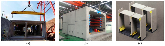 The currently existing prefabricated integrated utility tunnels can be classified according to the construction process into the whole section of the full prefabricated [9,10,12] (Figure 1a), split components of the full prefabricated [11] (Figure 1b), and mixed prefabricated [13,20,21] (Figure 1c). The specific characteristics of each classification are shown in Table 1 below.