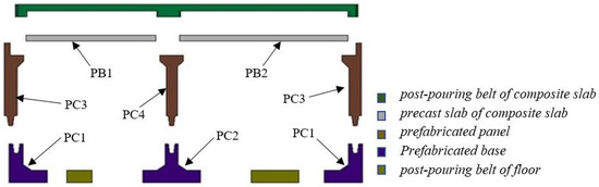 The new assembled integral utility tunnel adopts prefabricated composite slabs, and the walls and bases are connected by mortise and tenon joints, while the bases are connected by a post-pouring belt. The schematic diagram of the component division of the assembled integral utility tunnel is shown in Figure 3.