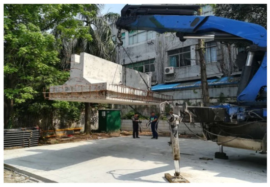 Before hoisting, the size and weight of each component were determined, and hoisting exercises were conducted using a small indoor model to develop a suitable hoisting and transportation plan. Finally, the model was hoisted and formed, as shown in Figure 11.