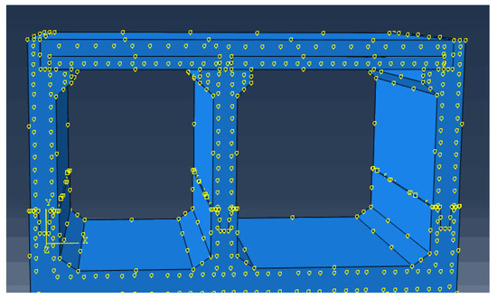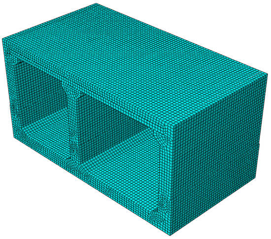 In the modeling process, the concrete is represented by C3D8R reduced-integration, hourglass-controlled eight-node linear hexahedral elements, with mesh refinement employed to address the “hourglass mode”. The steel reinforcement model includes horizontal reinforcement, longitudinal reinforcement, and corner reinforcement, which are calculated using T3D2 two-node linear three-dimensional truss elements [25]. To avoid the “hourglass phenomenon” and facilitate the observation of certain node positions, measures such as mesh refinement and striving for uniform mesh division are taken. The mesh size for concrete is set to 0.2 m, while the mesh size for steel reinforcement is set to 0.1 m. The assembled comprehensive utility tunnel model consists of 68,737 concrete elements and 74,625 concrete nodes, as well as 23,542 steel reinforcement elements and 24,678 steel reinforcement nodes. The division mesh diagram of the overall utility tunnel model can be seen in Figure 8.