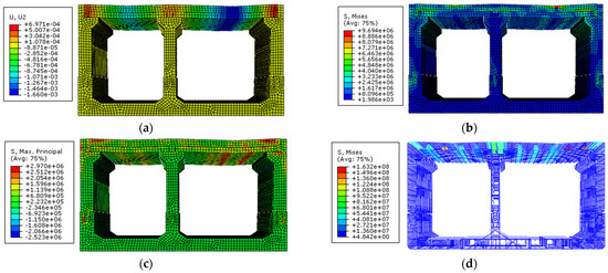The results of finite element analysis: (a) displacement, (b) stress, (c) principal stress, and (d) steel stress.