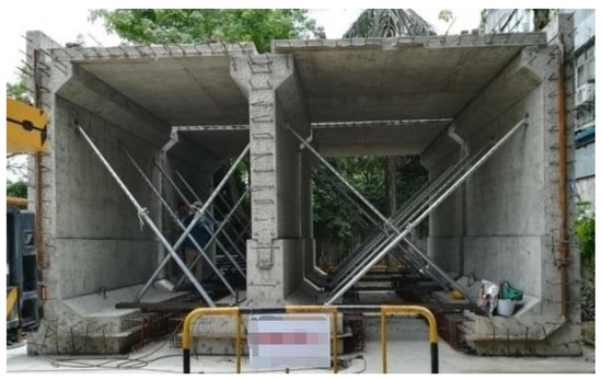 The full-scale model was later uniformly cast with C40 concrete, and the overlay top plate and post-pouring base plate were completed. The full-scale model was 7.4 m wide, 4.0 m high, and 4.0 m long.