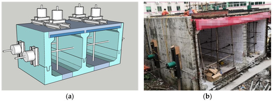 The top plate and side walls of both compartments were loaded using 300-ton hydraulic jacks, with a total of 8 jacks placed, controlled by a CNC device to regulate the loading rate and load size. In actual operation, in order to reduce local pressure effects, two 3 cm thick Q235 steel plates with dimensions of 1 m × 1 m and 0.6 m × 0.6 m were used as steel pads on the top plate instead of a secondary distribution beam. The testing device included loading devices for the top plate and side walls, as well as a data acquisition system. The layout diagram of the loading device on site can be seen in Figure 12b.
