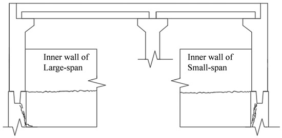 After loading the top plate to the standard combination value and design combination value, continuous loading was carried out for 30 min, and crack observations were made. It was found that when the load was increased to the standard combination value, no microcracks were found at the bottom of the top plate’s prefabricated slab. When loaded to the design combination value, slight cracks appeared at the longitudinal side wall tenon connection, and several hard-to-distinguish microcracks were found in the support area of the outer wall’s leg. When loaded to the final stage, the smallest crack width was 0.02 mm and the largest was 0.17 mm, with several cracks around 0.09 mm. The distribution of cracks in the key parts of the utility tunnel under the final load is shown in Figure 13, and the cracks in the remaining parts are not yet obvious. These surface cracks have little effect on the mechanical and waterproof performance of the utility tunnel.