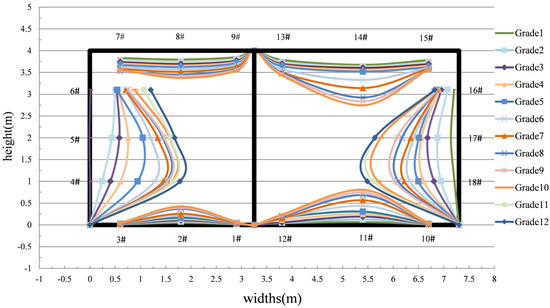The deformation data of each part measured can be displayed on a comprehensive displacement diagram of the assembled utility tunnel, as shown in Figure 14. The black box line in the figure represents the actual boundary size of the utility tunnel, and the deflection deformation at the corresponding position represents the deflection change trend. The change in displacement of the large compartment roof of the utility tunnel is the largest, and the outer walsl of the small and large compartments tend to move inward. As shown in the figure, the displacement of the large compartment’s side wall is greater than that of the small compartment.