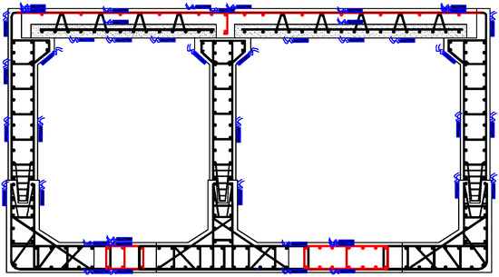 The composite slab was used for the utility tunnel roof, and the loading test mainly measured the stress-strain of the control sections, such as the continuous plate span and the support section under monotonic load; the distribution of the reinforcement and concrete strain measurement points are shown in Figure 15. The stress—strain relationship of the floor section was analyzed to investigate the force performance and synergistic working performance of the top slab of this design [27,28].