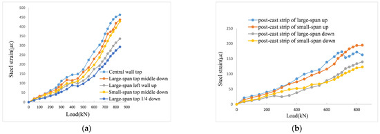As shown in Figure 16b, the strain of the upper and lower layers of reinforcement at the bottom plate of the two-span is not very large, and the trend of change is also slow. The analysis revealed the following reasons: on the one hand, it may be due to the steel strand tensioning process of the laminated top plate due to the elimination of pre-pressure, which slows down the stressing process of the reinforcement, and on the other hand, because the reinforcement rate of the post-cast zone is too large, the reinforcement is too thick, and the position and it may have a front and rear misalignment.