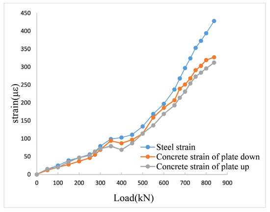 From the load—strain curves of the composite board at the mid-span and support positions, it can be seen that the development trend of the steel reinforcement load—strain curve and of the concrete load—strain curve at the mid-span during monotonic loading is not significantly different.