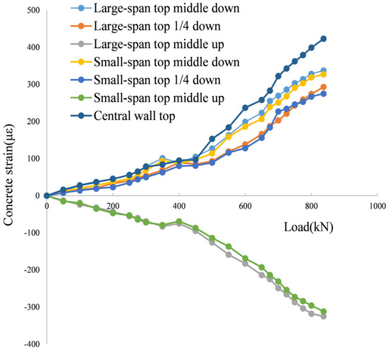The concrete strain diagram of the key positions on the top plate can be seen in Figure 18, showing that the bending moments at the middle and both ends are larger. Until the final loading, the load-bearing supports at both ends of the two plates did not experience shear failure. From the figure, it can be seen that the bending moment is the largest in the middle of the two-span, and the concrete strain at each position shows a linear trend. At this time, the plate is still in the elastic stage, indicating that there is still excess bearing capacity. The concrete at the end supports of the plate also meets the normal use requirements without shear failure, and the entire corridor did not experience bending failure.