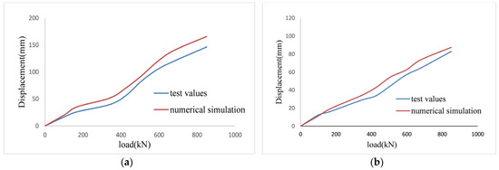 The measured data is formed into a curve diagram as shown in Figure 19a,b. The test results are lower than the finite element simulation results.