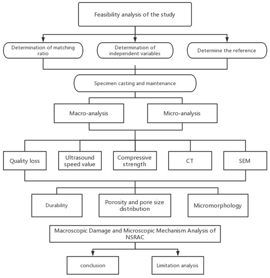 In this study, the specimen mass loss, residual compressive strength and ultrasonic sound velocity loss of concrete were used to evaluate the durability of NSRAC. The effects of different NS substitution rates on the durability of NSRAC after DWC in sulfate were investigated, and the microscopic morphology of concrete after DWC was analyzed by CT and SEM, and Figure 3 shows the flow chart followed in this study.