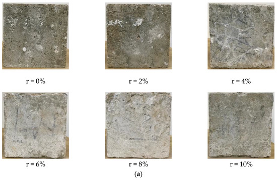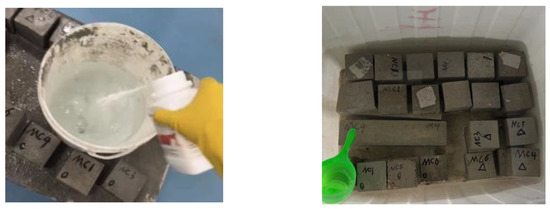 In order to study the different conditions exhibited by the degree of sulfate attack on concrete, the DWC method was used, which greatly reduced the test schedule. The dry and wet cycle test of concrete against sulfate corrosion used in this experiment was conducted according to the Chinese national standard GB/T 11975 [29] and the American ASTM 1012 standard. The circulating system was soaked in 15% Na2SO4 solution at room temperature for 16 h, removed and cooled and dried for 1 h, dried in an oven at 80 °C for 6 h, cooled and dried for 1 h and then weighed or compressed for strength. One cycle is 24 h. Then it was placed in a 15% Na2SO4 solution. Immersion in the 15% Na2SO4 solution (Figure 4) showed the most visualized degree of corrosion on the concrete.