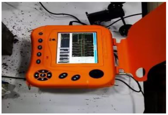In accordance with CECS 02-2005 C.F.R. [30] technical regulations for testing the compressive strength of concrete by ultrasonic rebound synthesis method, a non-metallic ultrasonic testing analyzer was used, as shown in Figure 5, and the relative surface perpendicular to the pouring surface was selected as the ultrasonic testing area. On opposite test surfaces, three test points were drawn diagonally, and to ensure good test results, a layer of butter was applied to the test points. In the corresponding designated test points, so that the transmitter and receiver can be smoothly opposed, the two sensors are always kept on the same axis; if the test points are found to have protruding mortar, they should be cleaned up immediately, otherwise there is a direct impact on the test results. The measured sound velocity value of each test block should be carried out one by one from top to bottom, and the results should be recorded three times at each point, and finally, the average value should be obtained and then divided by the width of the test piece L (L = 150 mm) to obtain the sound velocity value, and two valid digits can be retained after the decimal point. The relative dynamic modulus of elasticity is measured indirectly by the propagation velocity of ultrasonic waves in the specimen, and the RDEM is calculated by equation using a non-contact ultrasonic measuring instrument. RDEM was measured every 25 repetitions of DWC.