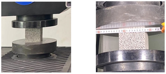 According to the requirements of Chinese National Standard GB/T 50081 [31], a WAW-1000 kN universal testing machine was used. The loading speed was 0.5 Mpa/s. The cube size was 100 mm × 100 mm × 100 mm, and the results were taken as the average of three test blocks for each ratio. The cube compressive strength testing device is shown in Figure 6.